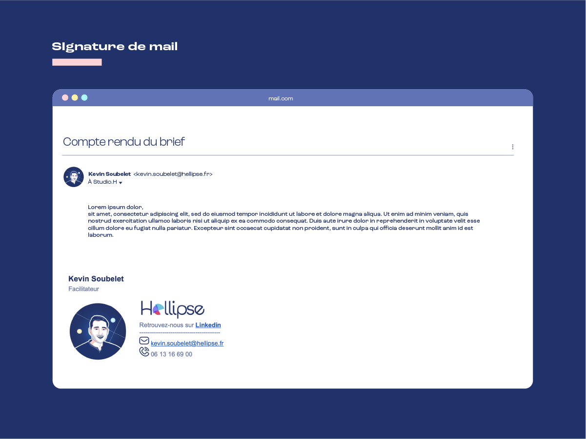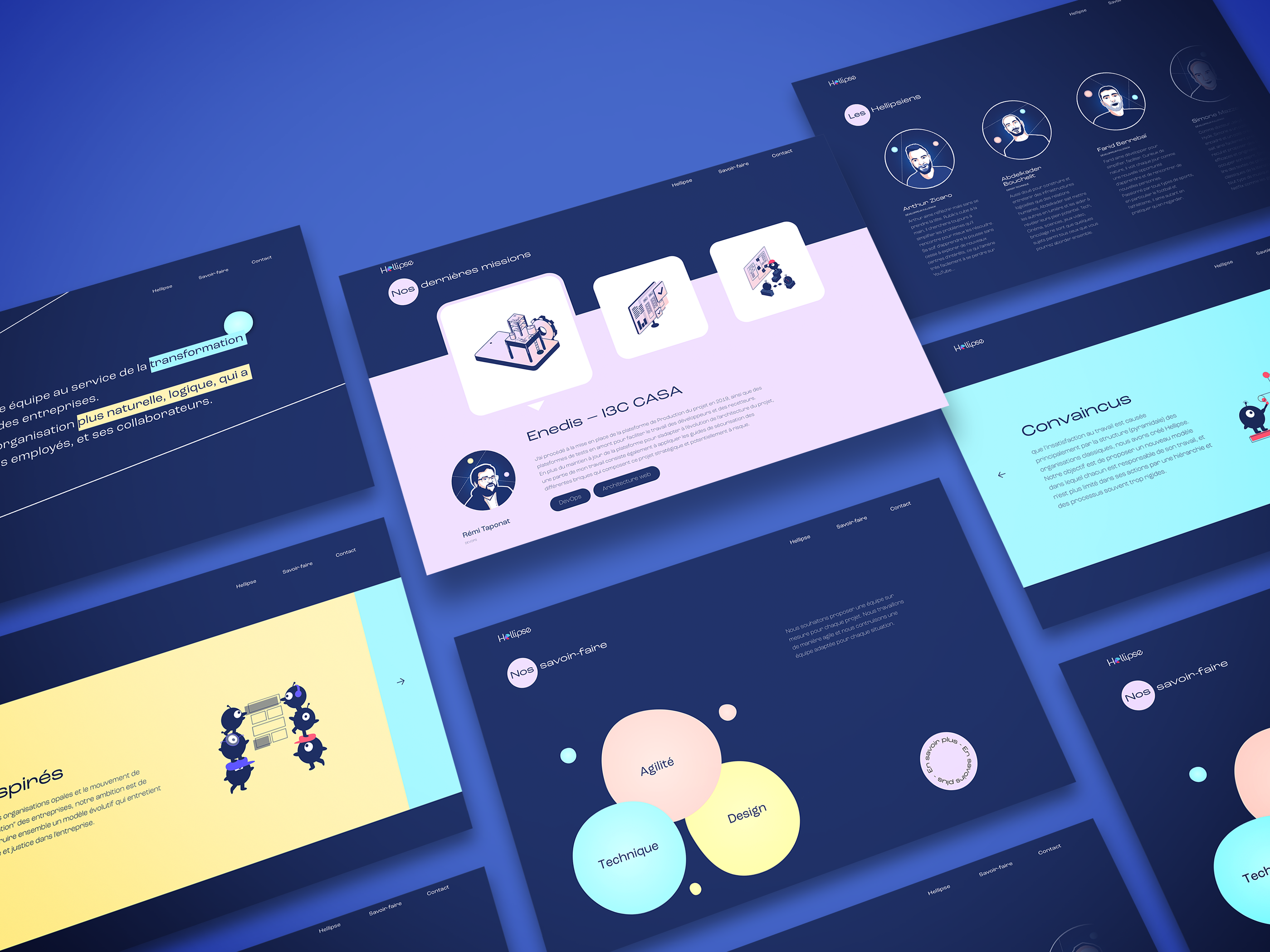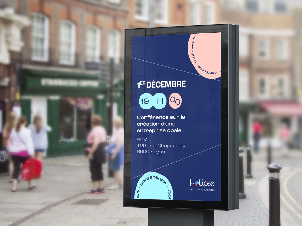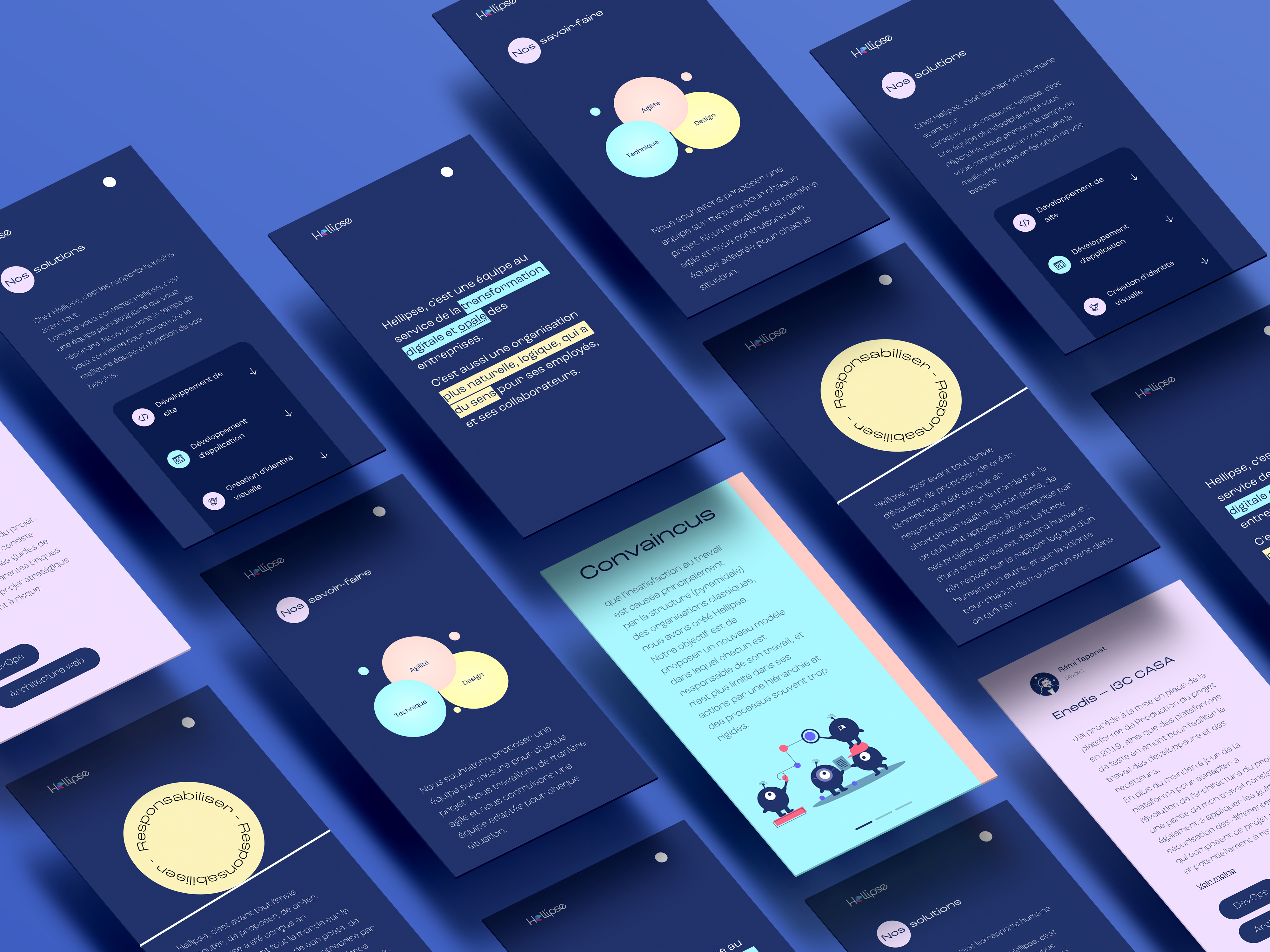 Les besoins d’Hellipse étaient assez bien définis à mon arrivée : étant une jeune entreprise, il leur fallait communiquer sur leur existence et leurs activités. Mon travail en tant que Directrice Artistique était de comprendre le sens de leur fonctionnement, ce qui les animait, et ce vers quoi ils tendaient pour être au plus juste dans ma retranscription graphique en parlant à la bonne cible sur le bon ton. Bien sûr, cette communication allait aussi passer par plusieurs canaux et supports que j’ai aidés à mettre en place tout au long de cette année.