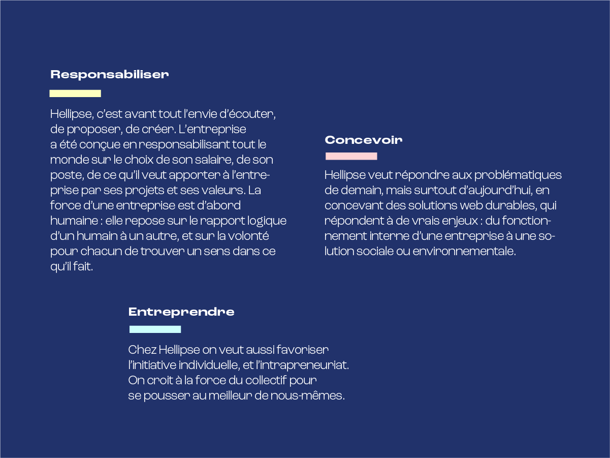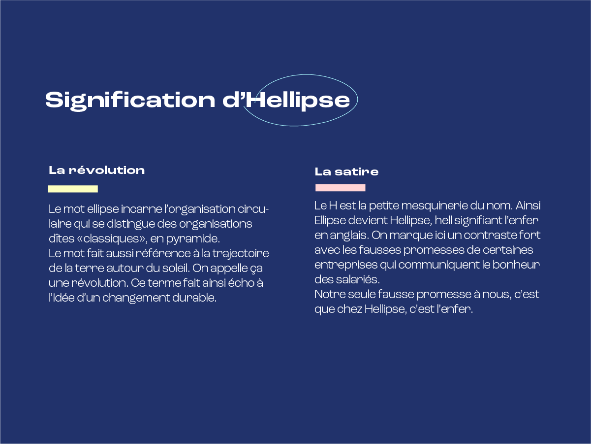 Hellipse c’est une entreprise qui souhaite créer des interfaces et logiciels sur-mesures, mais qui trouve aussi sa force dans la volonté de transformer les processus en entreprise avec un management plus juste et transparent.