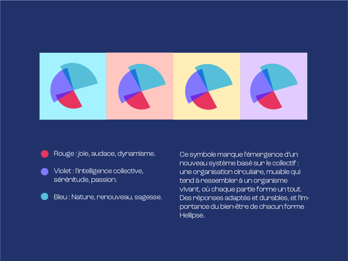 Est venu le jour où nous avons pris une après-midi pour que je puisse leur présenter mes différentes pistes. Chacune d'elle permettait d'appréhender Hellipse sous un angle différent. C'est pourquoi l'accord de chacun sur une piste m'était essentiel pour partir sur le bon logo et le bon travail de communication visuel qui allait graviter autour. Voici la piste sélectionnée : Le logo avec une icône qui évoquait l’organisation logique, muable et collective qu’ils souhaitaient mettre en place au sein d’Hellipse. J’ai cependant proposé deux déclinaisons de ce logo suite à certaines remarques qui voulaient voir d’autres comportements possibles du symbole.