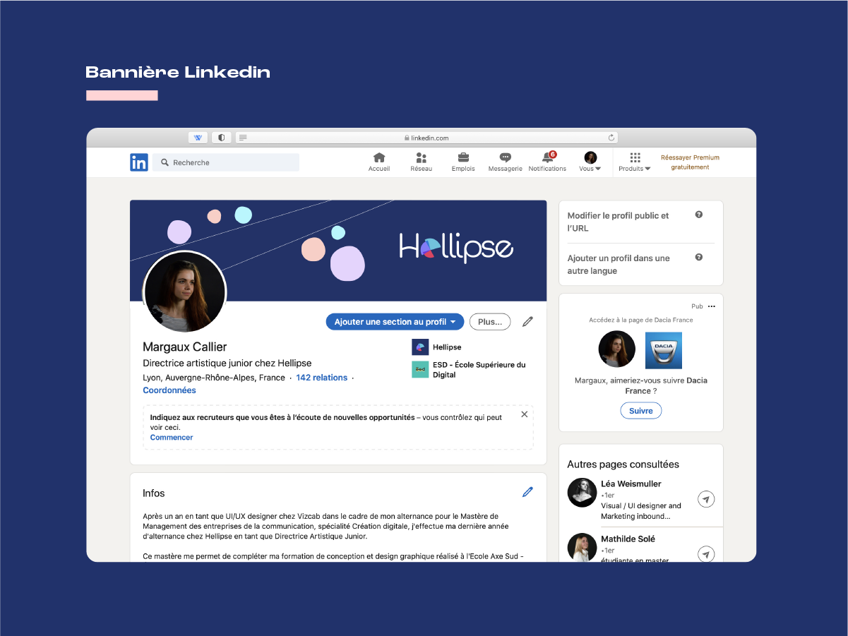 Lors de mon process créatif, j'ai réfléchi à comment partager de manière originale sur Linkedin la charte graphique d'Hellipse. En effet, personne ne s'était occupé d'entretenir les réseaux, il fallait donc introduire la nouvelle charte, et rendre vivant et visible Hellipse après quelques mois d'absence. J'ai alors réalisé une animation retraçant la manière dont Hellipse s'est créée par un storytelling très imagé : Le Big Bang d'Hellipse.
